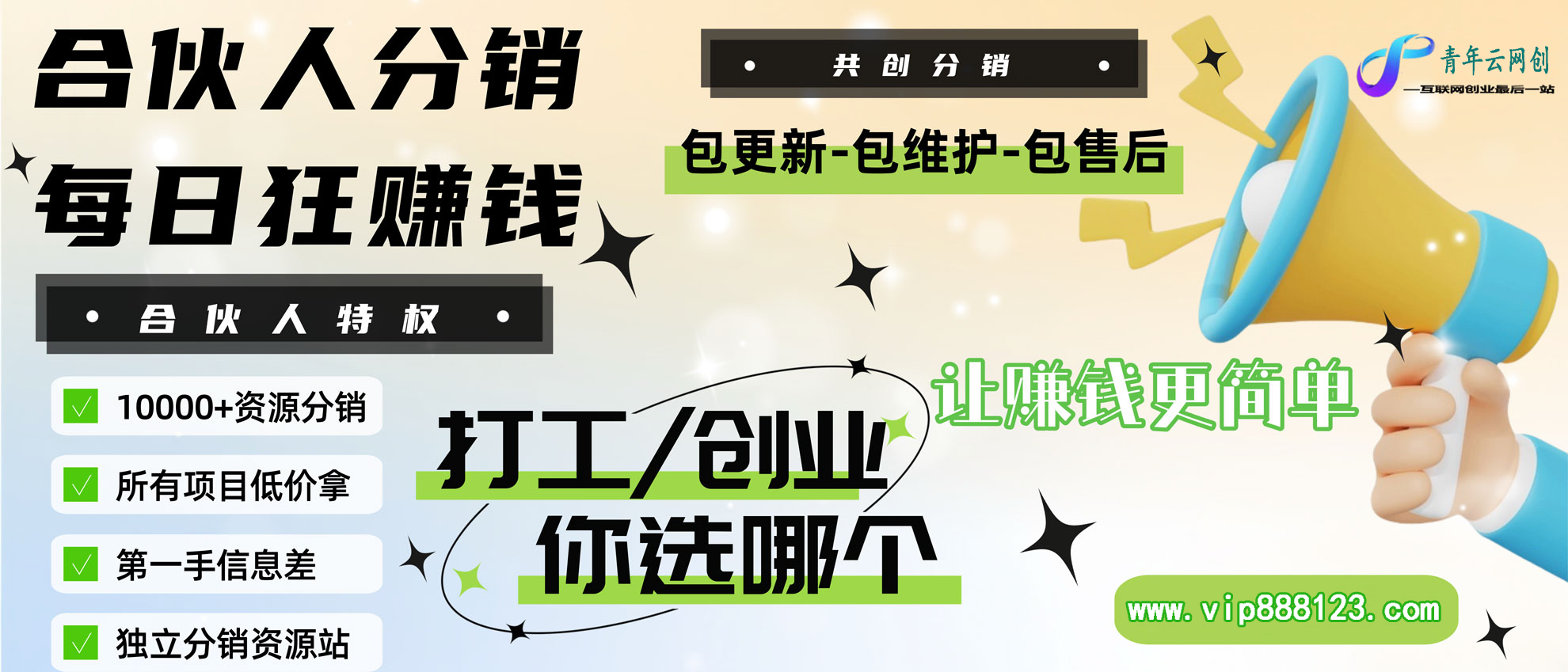 加入青年云网创会员,全站资源免费学习。加入高级合伙人,推广日入1000+